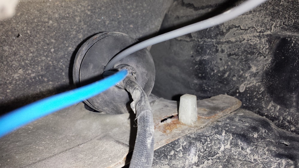 Jag har demonterat lådan under bagagerumsmattan, men jag hittar inget hål som är lämpar sig för att dra ut kabeln ifrån lastutrymmet till under bilen.